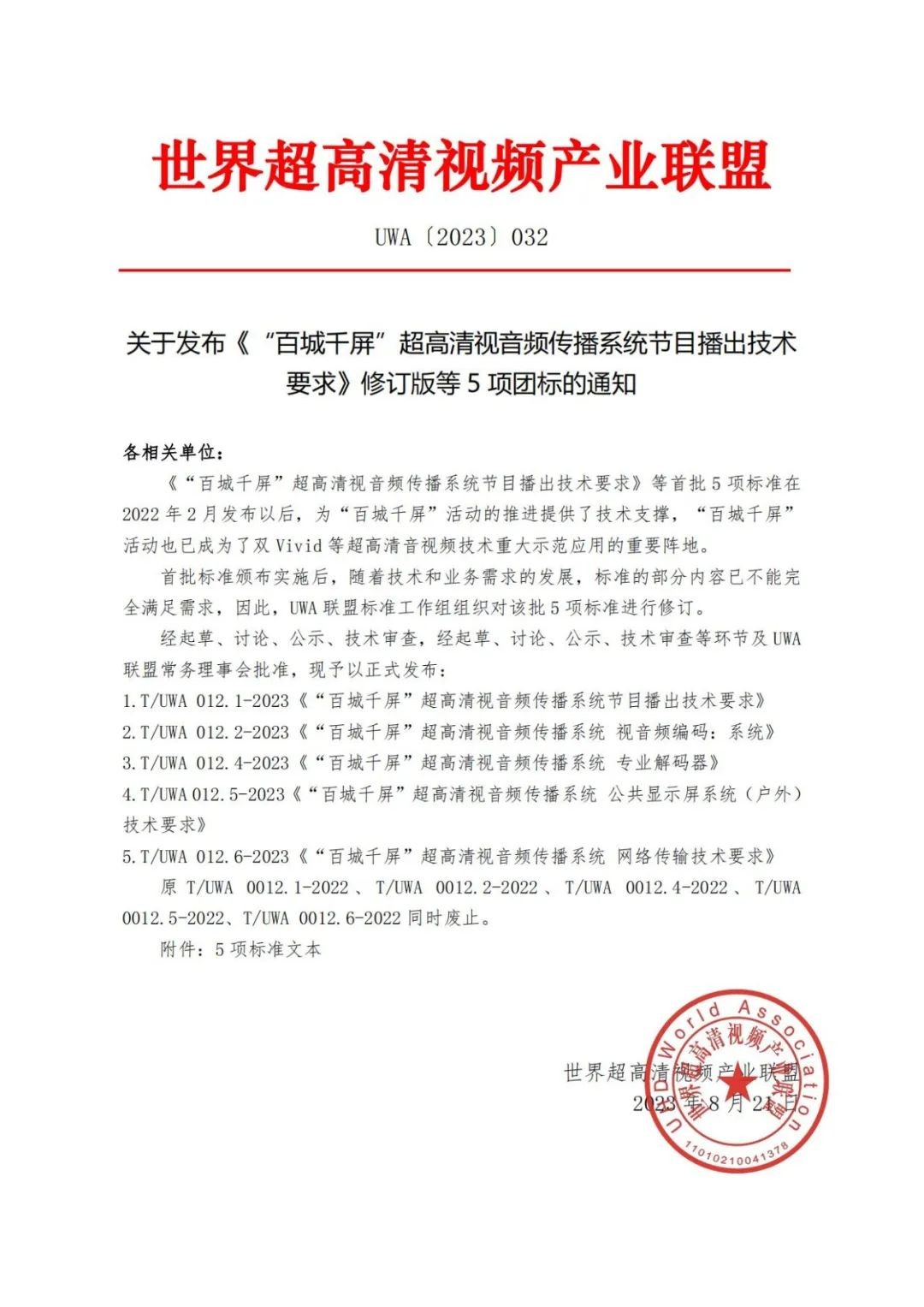 【UWA动态】关于发布《“百城千屏”超高清视音频传播系统节目播出技术要求》修订版等5项团标的通知