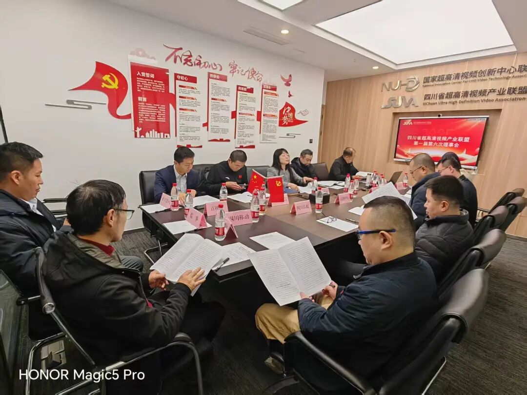 2025年11月28日,四川省超高清视频产业联盟(以下简称“联盟”)第一届第六次理事会议于联盟会议室隆重召开。本次会议由联盟秘书长王乐主持。中共四川省超高清视频产业联盟功能型党支部书记,理事长单位国家超高清视频创新中心,会长单位中国电信股份有限公司四川分公司、会长单位四川广播电视台,副理事长单位四川长虹电器股份有限公司、副理事长单位中国移动通信集团四川有限公司、副理事长单位中国联合网络通信有限公司四川省分公司、副理事长单位成都京东方显示科技有限公司、副理事长单位四川天邑康和通信股份有限公司、副理事长单位百视通网络电视技术发展有限责任公司、四川省超高清视频产业联盟监事等核心成员单位与会。会议旨在系统总结联盟年度工作,共商产业发展大计,并重点围绕贯彻落实省领导重要批示精神,全力推进“千市万厅”超高清智慧视听综合服务示范项目落地实施进行深度研讨与部署。